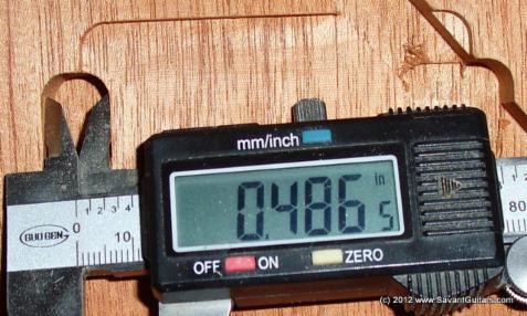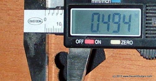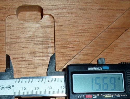... next pic is misleading: the diameter of the hole in the mahogany shim was precisely measured and then the caliper was placed on top of the body, but unfortunately not fully above mid of the hole ... the hole is 1/2 inch in diameter and is the (future) guide for drilling the hole of according size into the maple (after the top is glued on the body). Then the existing hole in the mahogany is extended to 3/4 inch to accept the underside of the toggle swiitch by a tilt rout (following the curve of the top for placing the tilt toggle switch parallel to the top curve). So: hole through the maple top is 1/2 inch, hole in the mahogany shim is (finally) 3/4 inch.
