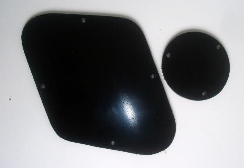 The Backplates were made of (rolled) Vinyl (2.2 - 2.3mm thick), outline was punched and has shearing marks, dimensions taken from a "real one" (original set from a 1959 Burst). Vintage shaped, will NOT fit Historic or modern. 29 Euro/set (+ shipping)
