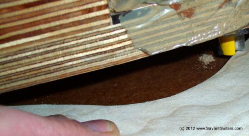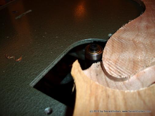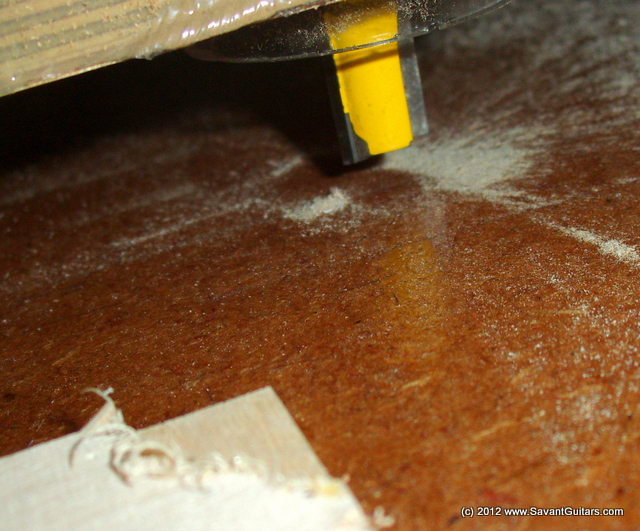 ... once done around the edge (except the horn/cutaway section of course) we end up with the right thickness around the edge, leaving some routing marks (not visible well in the pic below, still hard to take pics from some things):
