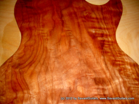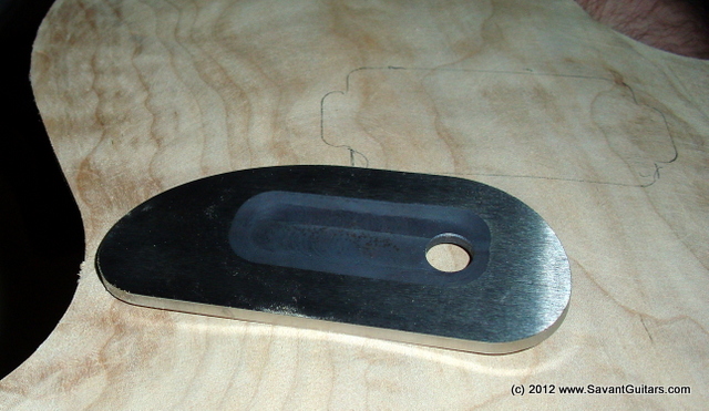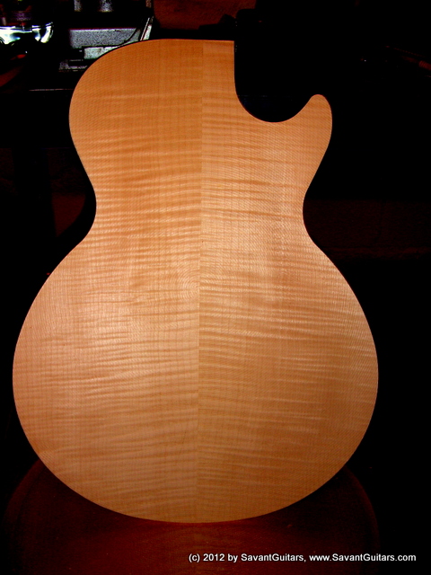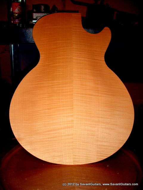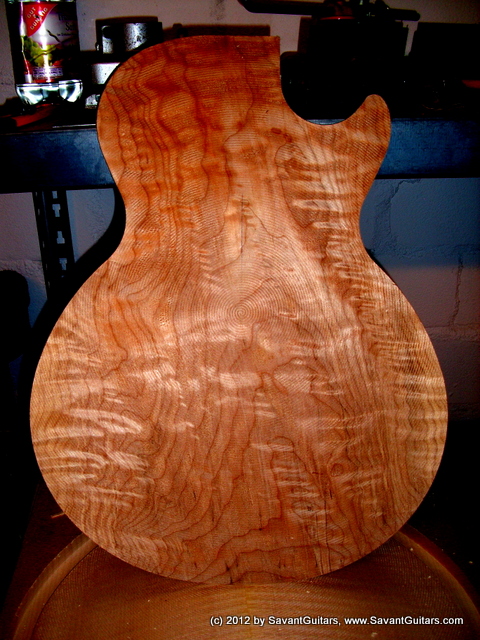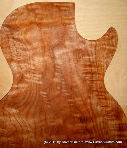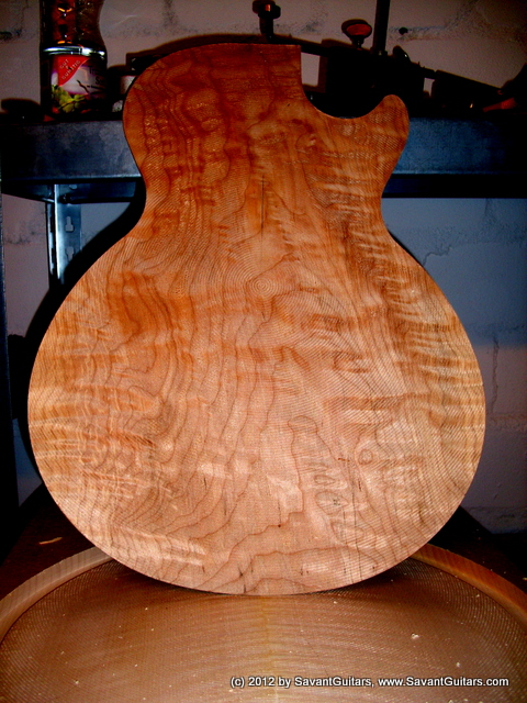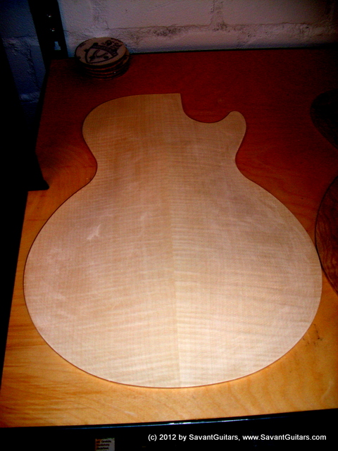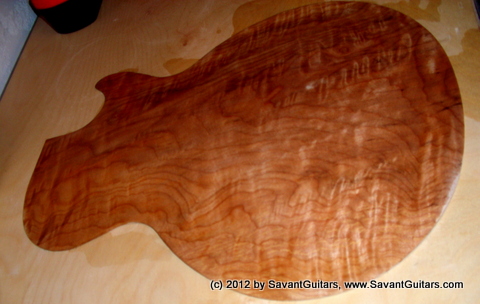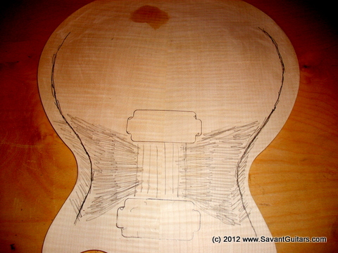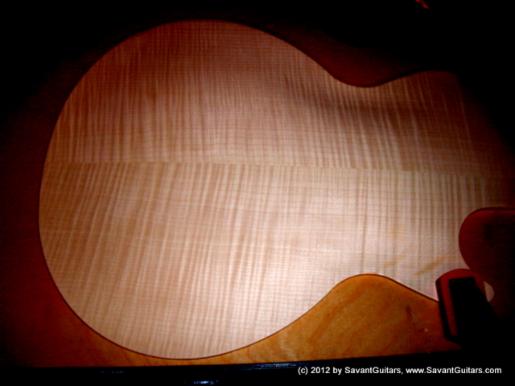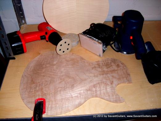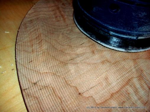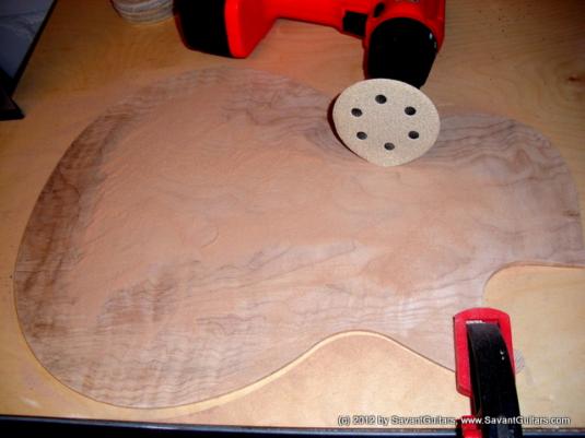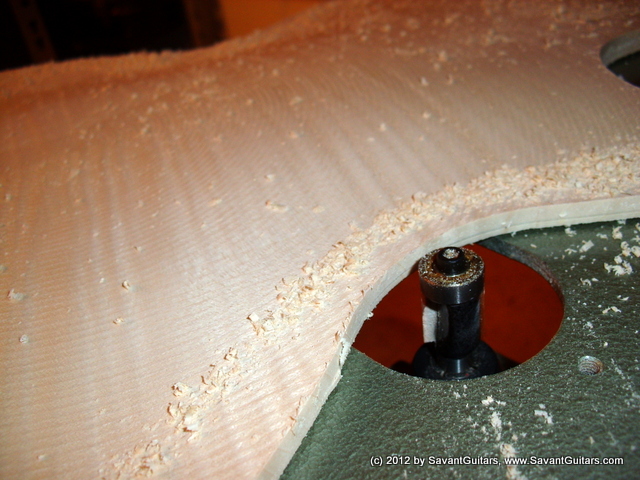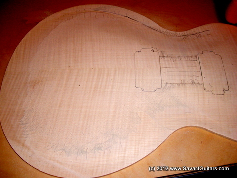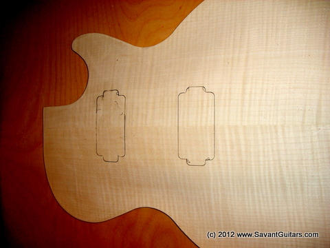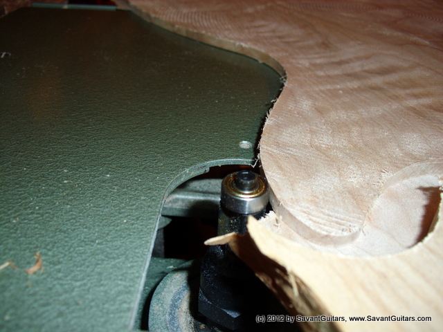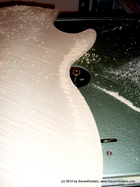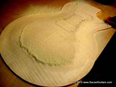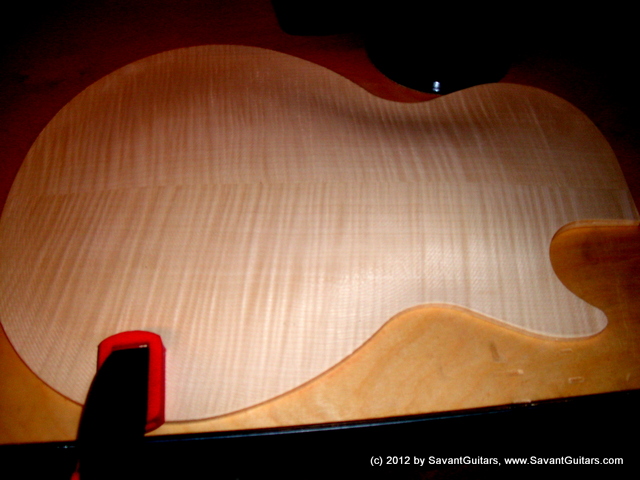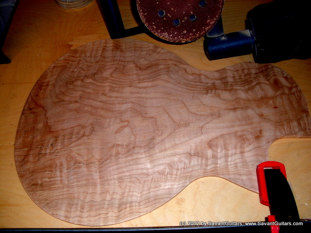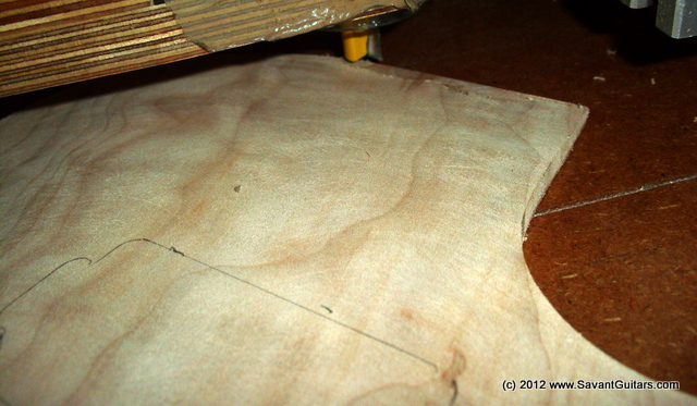 Same process as above is done to the flamed maple top. The customer wants the waist part of the top to be more contoured and profiled (narrowed), the right time to do the rough work for this is now:
