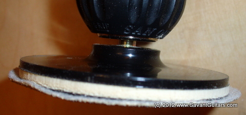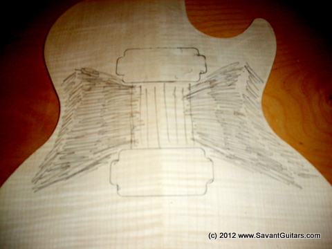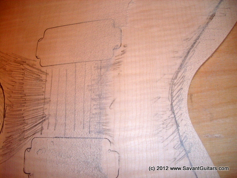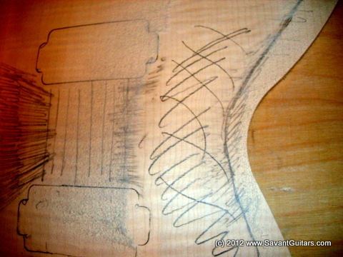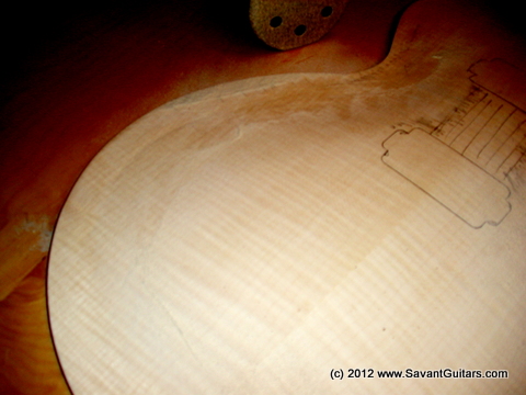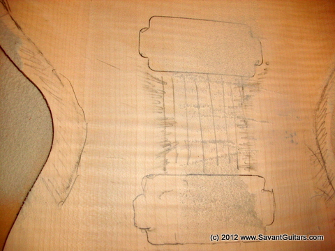 Same procedure to the other side of the waist (note the erased pencil marks and the intact ones between the humbucker positions: here we do want an unaltered (slightly domed) surface and no sanding):