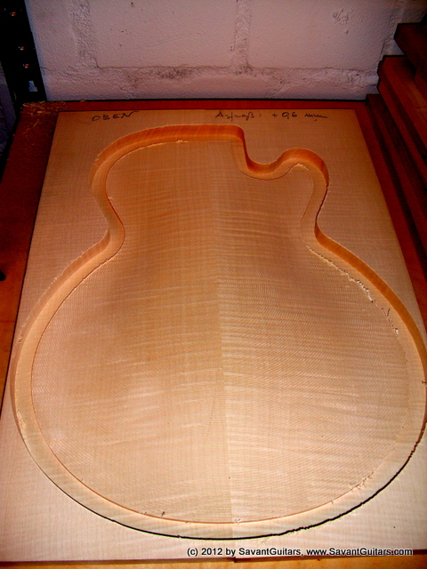 The tops and backs for the builds shown here we did on the CNC, big advantage is minimizing the time consuming carving process, apart from accuracy of course, this way we can start with sanding and no planes and rough machines are needed... the disadvantage is that CNC´ing just makes economically sense when producing lots of i.e. 15-20 pieces. From the (compared to hand-held routers) fast CNC-routing operations the wood´s surface heats up from milling, a bit more than doing this process slowly by hand. Therefore the wood has to be especially dry to avoid warping. We are lucky to have about 50 well seasoned and highly figured maple tops in stock, some you can find here.