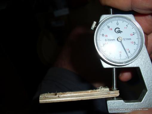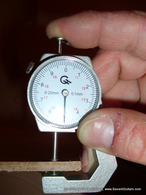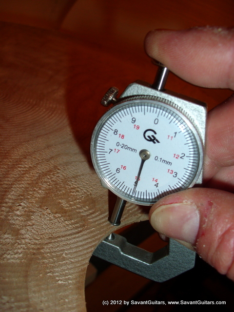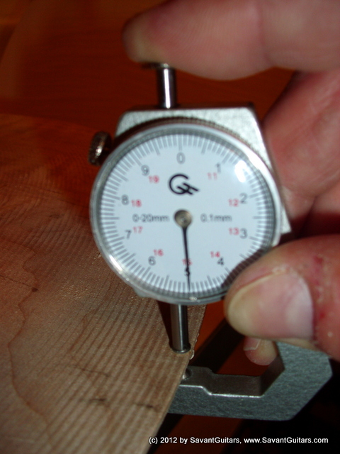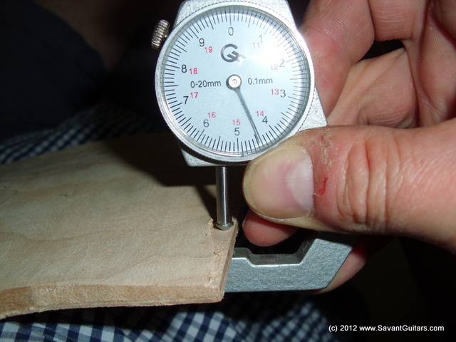 Check of the thickness at the edge around the outline (top has approx. +0,5mm additional "meat" at this stage for final profiling and sanding down to final edge thickness of 4.4 - 4.5 mm):