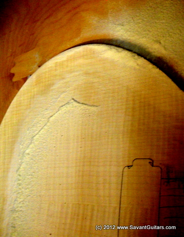 Next to come: details of final preparation of the top shape (1.1 degree plane at centerline from bridge to top and 4.0 degree neck plane) and finally setting the edge to the right thickness before gluing the top to the mahoganie core.