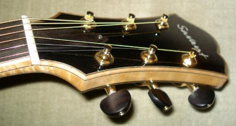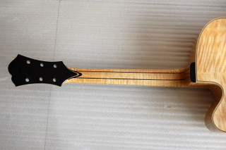 - 5-piece multi-layer neck of flamed maple with ebony inserts "wedge-style" (adding additional stiffness)